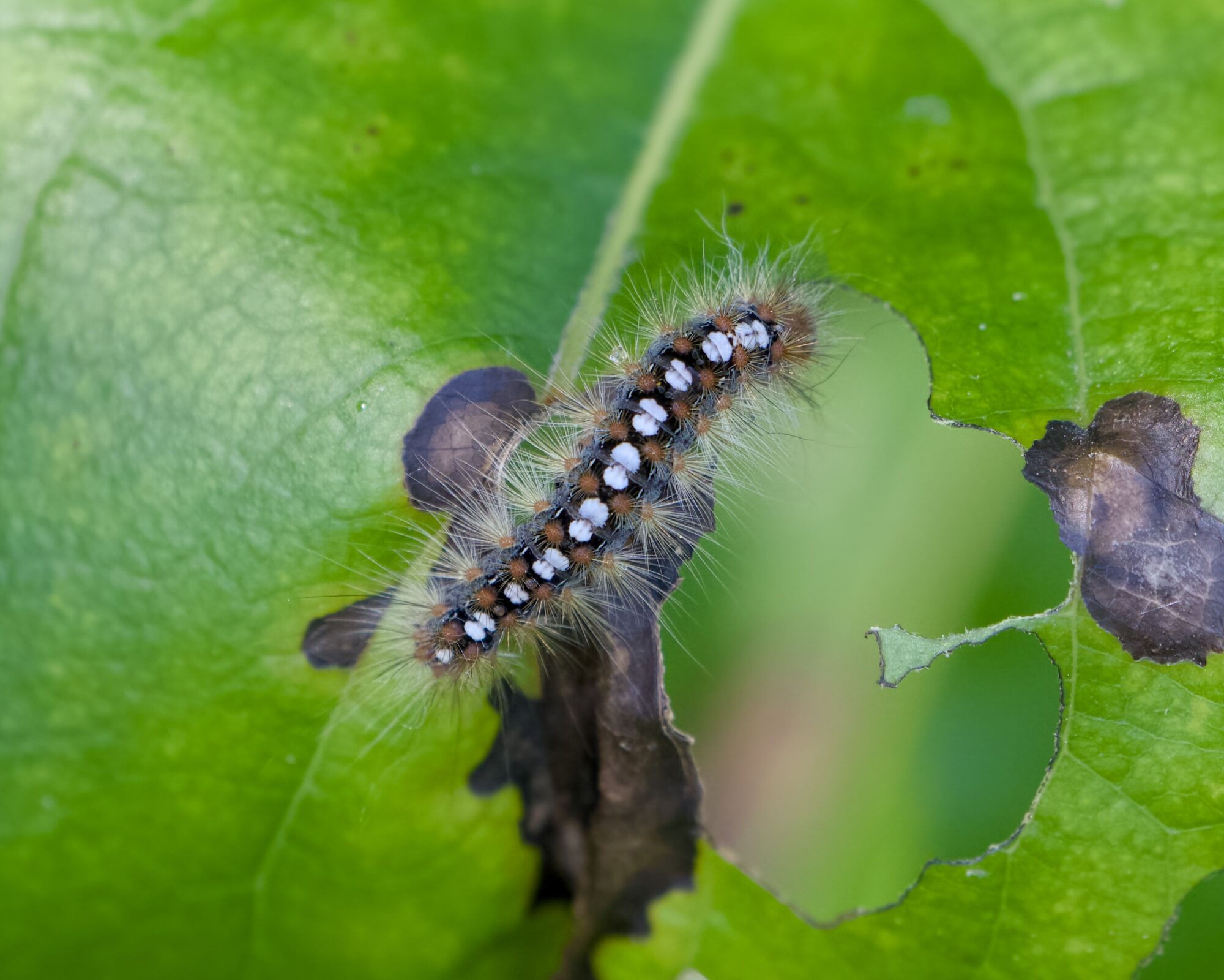 This colourful and hirsute fella is a Satin Moth caterpillar. They’re considered a bit of a pest, feeding voraciously on the leaves of poplars and willows. However, they rarely cause permanent damage to trees, and already have a number of natural enemies so their populations are usually kept in check without human intervention.