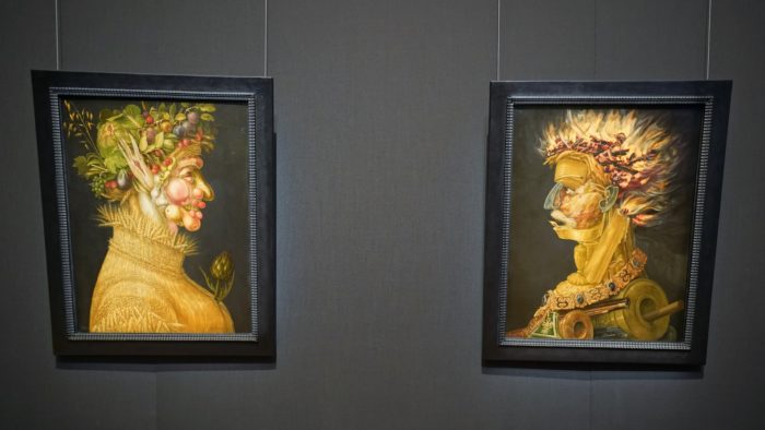 Two paintings by Giuseppe Arcimbolo, imperial court painter in Vienna and Prague. In 1562 he created a series of weird portraits based on the seasons, with “Summer” seen on the left, with all the richness and productivity of the season. A few years later he produced a four-part series on the elements, with “Fire” here on display.
